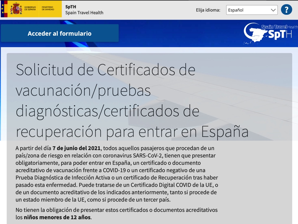 A partir del día 7 de junio del 2021, todos aquellos pasajeros que procedan de un país/zona de riesgo en relación con coronavirus SARS-CoV-2, tienen que presentar obligatoriamente, para poder entrar en España, un certificado o documento acreditativo de vacunación frente a COVID-19 o un certificado negativo de una Prueba Diagnóstica de Infección Activa o un certificado de Recuperación tras haber pasado esta enfermedad. Puede tratarse de un Certificado Digital COVID de la UE, o de un documento acreditativo de los indicados anteriormente, tanto si procede de un estado miembro de la UE, como si procede de un tercer país.
